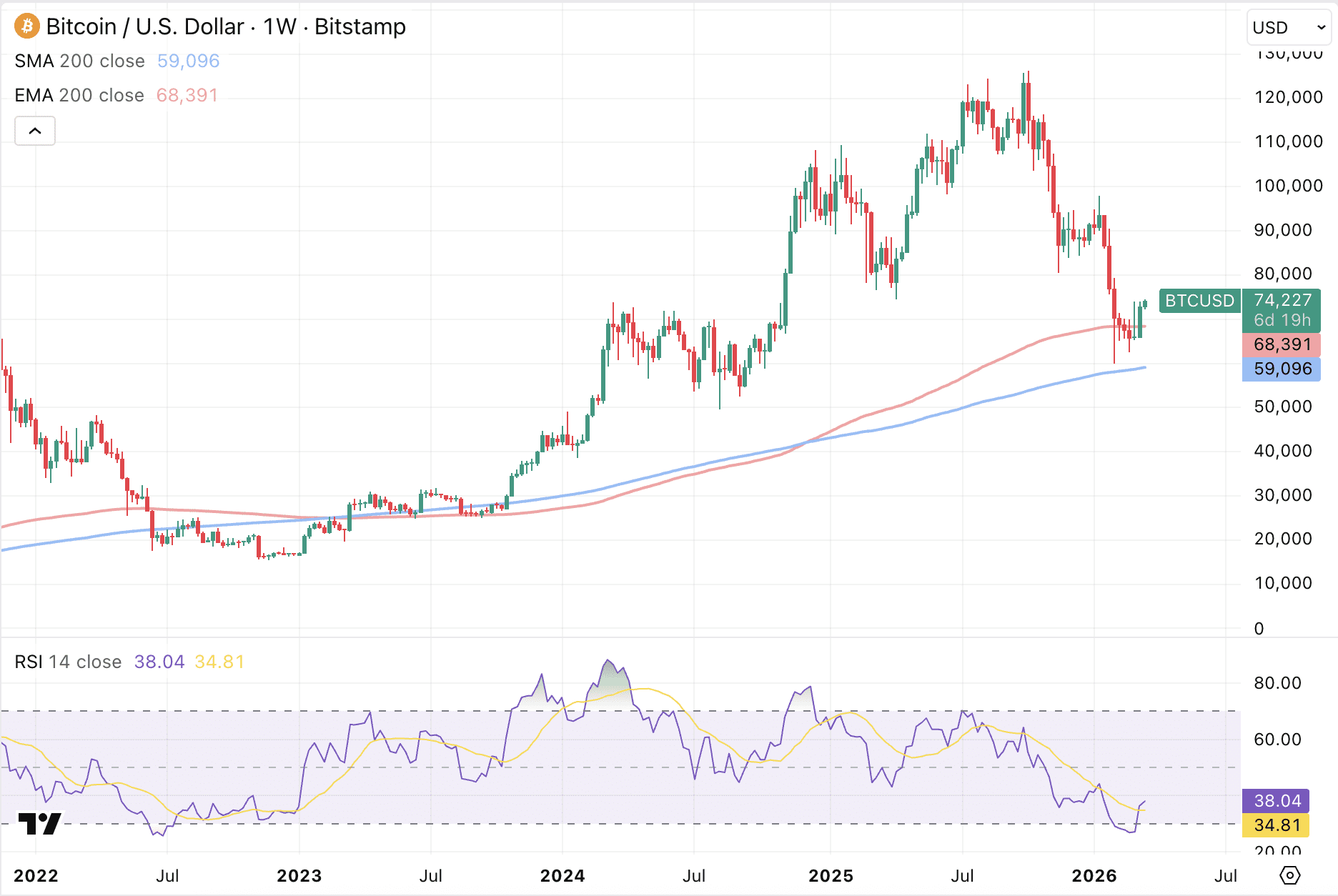 Vor wenigen Stunden erzielte Bitcoin einen bedeutenden Erfolg im Wochenchart. Dort wurde ein Wochenschluss über dem 200-Wochen-EMA erreicht.