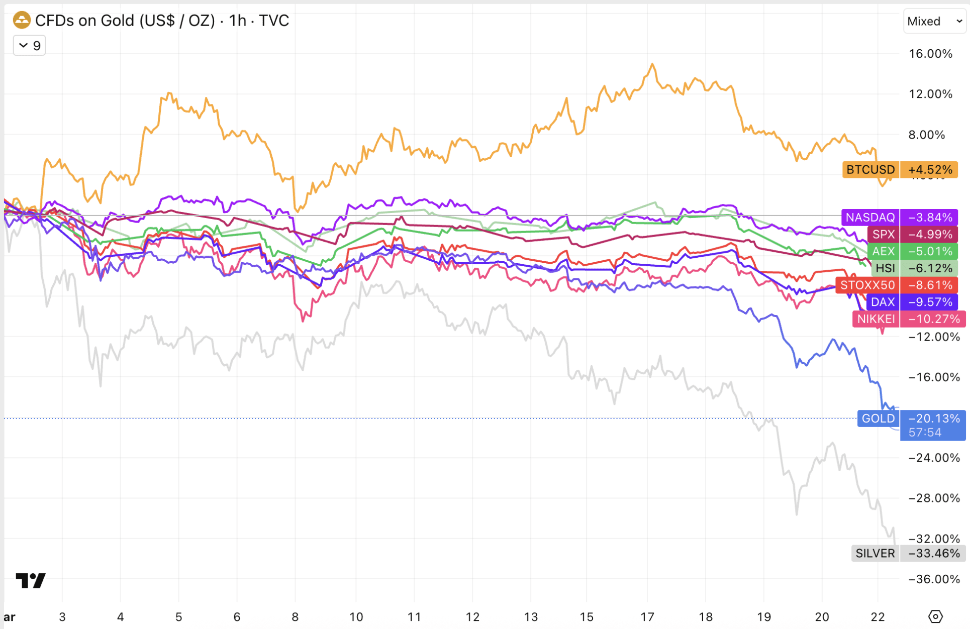 Dennoch hat sich Bitcoin seit Beginn des Konflikts mit einem Anstieg von 4,5 Prozent relativ gut geschlagen. Besonders im Vergleich zu Gold (-20 Prozent) und Silber (-33 Prozent) sind die relativen Leistungen beeindruckend.