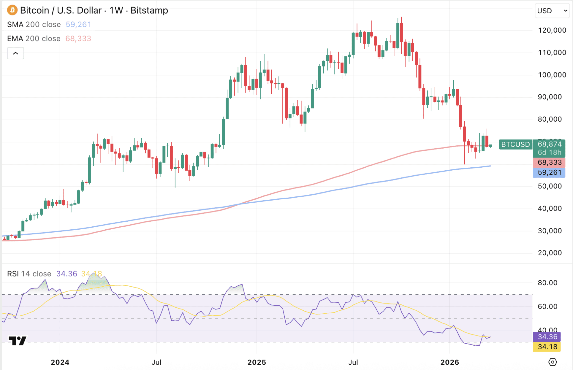 Derzeit kämpft Bitcoin darum, über dem 200-Wochen-EMA zu bleiben. Dies gelang in der vergangenen Nacht knapp nicht. Bitcoin schloss leicht unter diesem Durchschnitt und verpasste damit das zweite Wochen-Schlusskurs oberhalb dieser Marke.