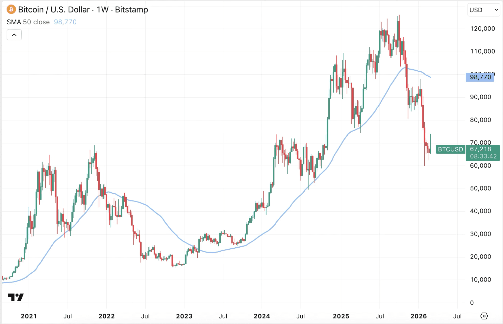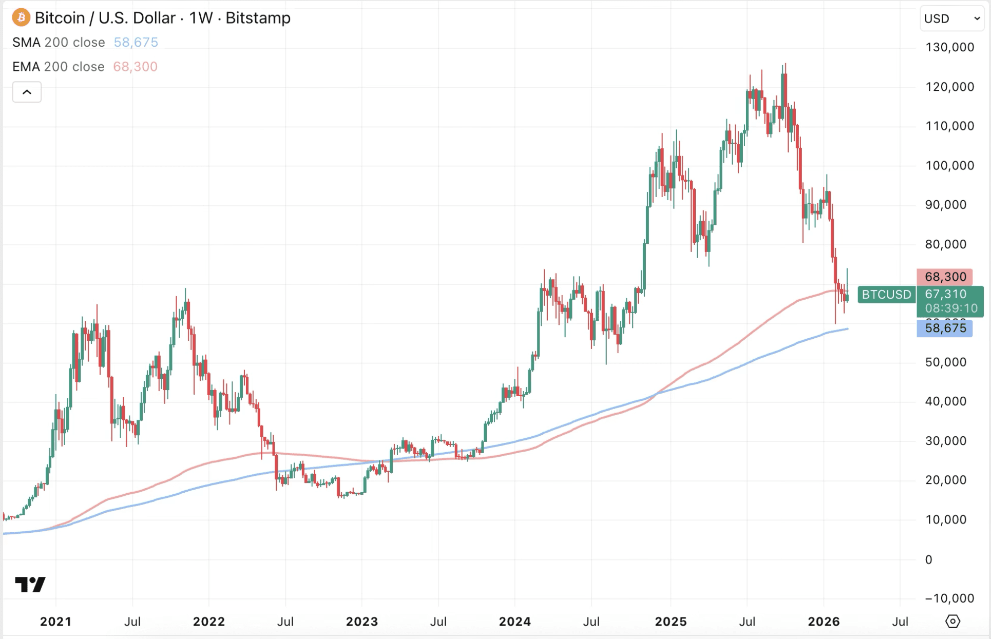 Dieses Kursdurchschnitt fungiert in der gesamten Geschichte von Bitcoin als wichtige Trennlinie zwischen Bullen- und Bärenmärkten.