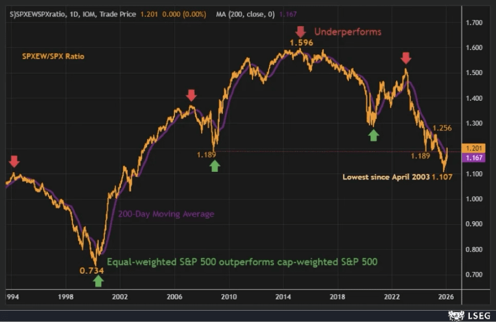 An der US-amerikanischen Börse zeichnet sich seit Oktober 2025 eine bemerkenswerte Entwicklung ab. Während die Tech-Giganten lange Zeit den S&P 500 dominierten, zeigt sich seit dem letzten Quartal des Vorjahres ein Wandel. Ab diesem Zeitpunkt schneiden die kleineren Unternehmen besser ab, was in der untenstehenden Grafik durch die aufsteigende orangefarbene Linie sichtbar wird.