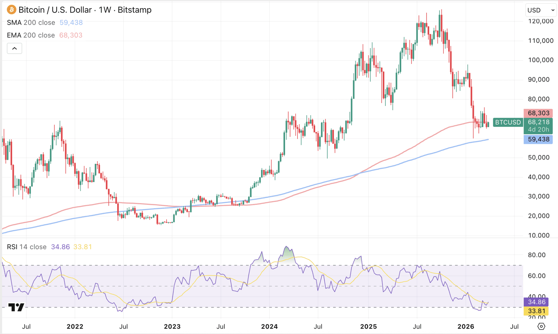 Die kommenden Tage werden zudem entscheidend für Bitcoin. Am Sonntag könnte Bitcoin einen Wochenschluss über dem 200-Wochen-EMA (exponentieller gleitender Durchschnitt) erreichen (rote Linie). Die Rückeroberung dieser Linie markierte in der Vergangenheit oft das Ende von Bärenmärkten.