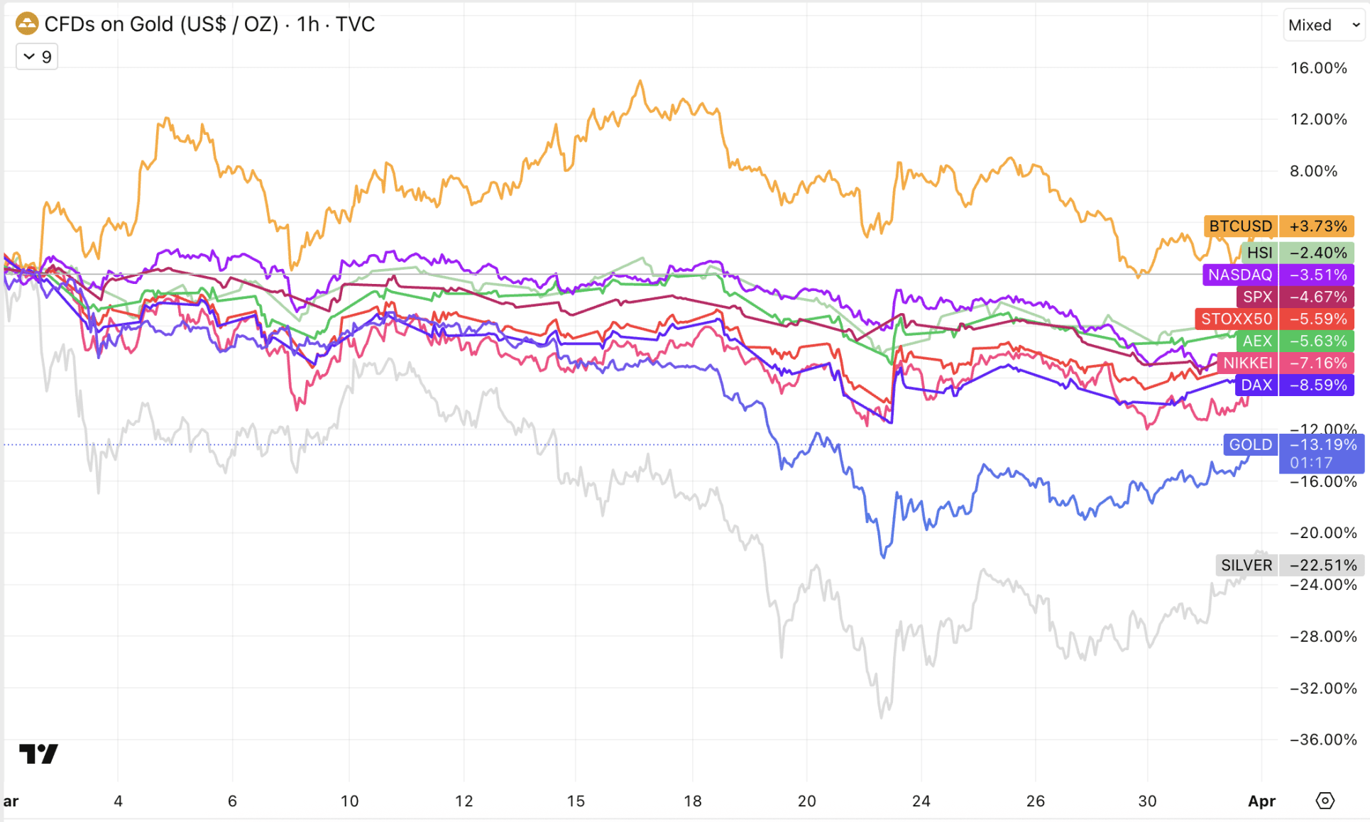 Das wäre bedauerlich, denn gerade jetzt zeigt Bitcoin wieder positives Momentum, insbesondere im Vergleich zu vielen anderen großen Assets. Seit Beginn des Krieges sieht die Bilanz auf den Finanzmärkten folgendermaßen aus.