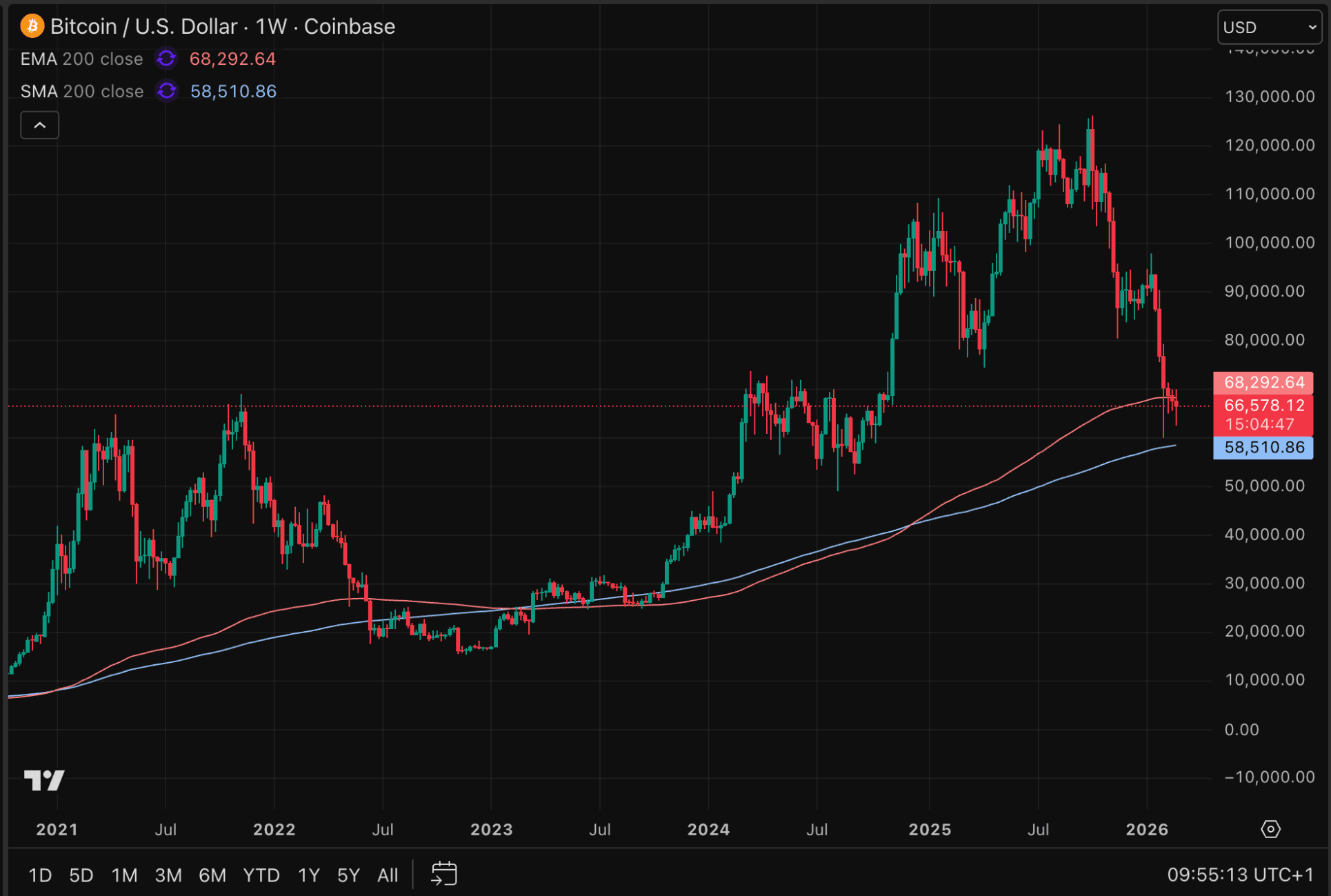 Auf kurzfristiger Basis bewegt sich Bitcoin zwischen dem 21-tägigen exponentiellen Durchschnitt (gelb) und dem 200-Wochen-Durchschnitt bei etwa 58.000 Dollar (rot) in der folgenden Grafik.