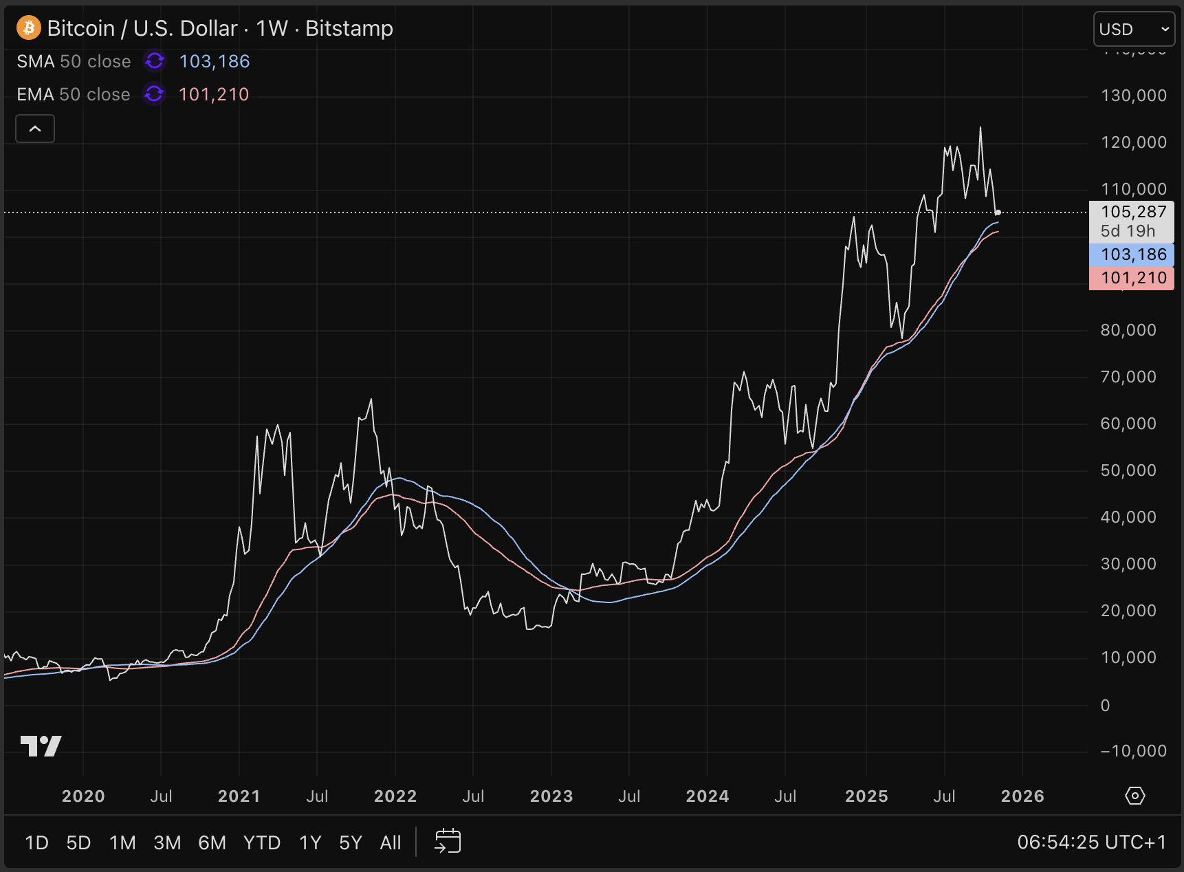 Bitcoin (BTC) hat eine schwierige Phase hinter sich und scheint sich derzeit um die Marke von 105.000 US-Dollar zu stabilisieren. Dieser Kurs liegt genau auf dem 50-Wochen-Durchschnitt der Kryptowährung (blau). Üblicherweise gilt er als wichtige Trennlinie zwischen Bullen- und Bärenmärkten. Verliert Bitcoin diese Linie, könnte die Party vorbei sein.