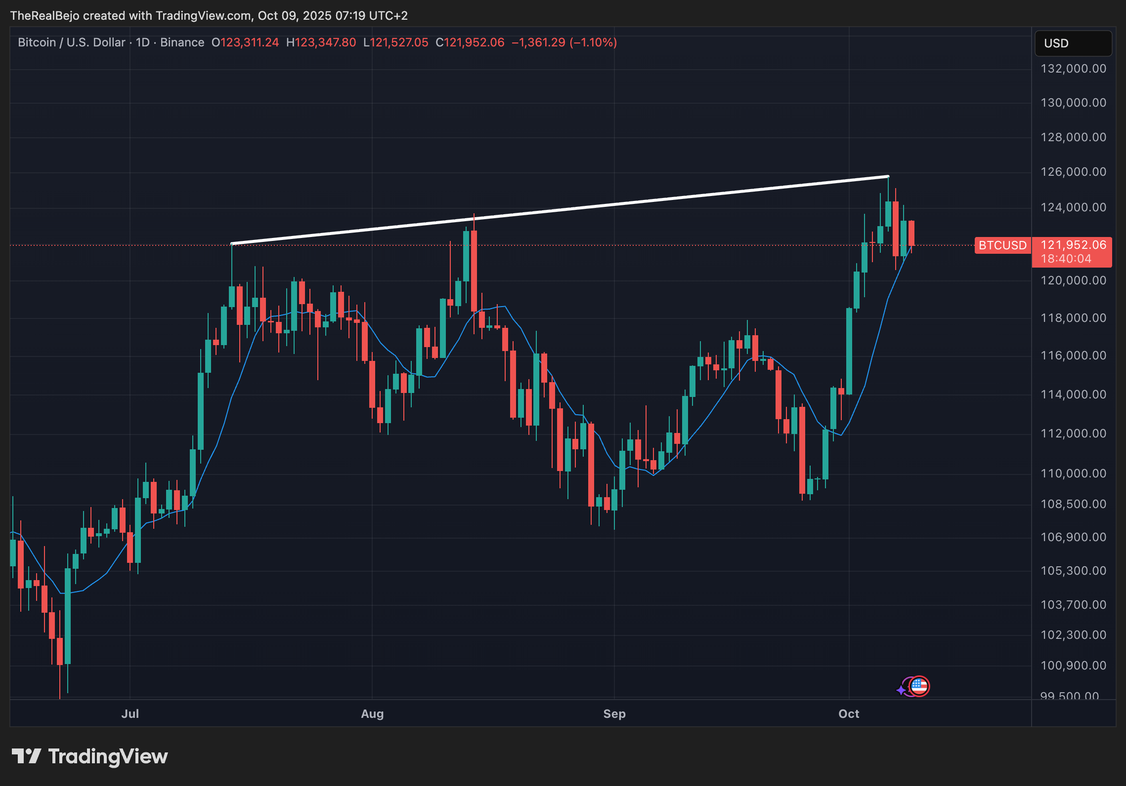 Der Bitcoin-Kurs steht an einem wichtigen Scheideweg. Kurz nachdem er ein Allzeithoch von über 126.000 Dollar markiert hat, tun sich die Bullen nun wieder schwer. Bitcoin handelt bei 122.200 Dollar und scheint um dieses Niveau herum auf spürbaren Widerstand zu treffen.