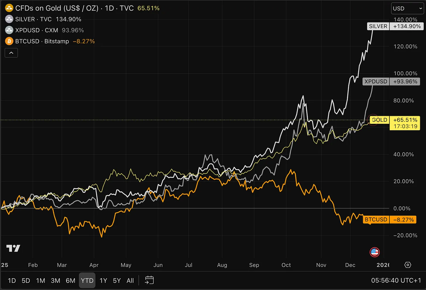 Obwohl Bitcoin im Jahr 2025 mit einem negativen Ertrag von etwa 8 Prozent ein schlechtes Jahr hatte, laufen Gold und Silber hervorragend. Bitcoin ist bei Investoren als digitale Version von Gold bekannt. Aktuell zeigt sich das nicht in den Kursen, könnte aber später zugunsten von Bitcoin ausfallen.