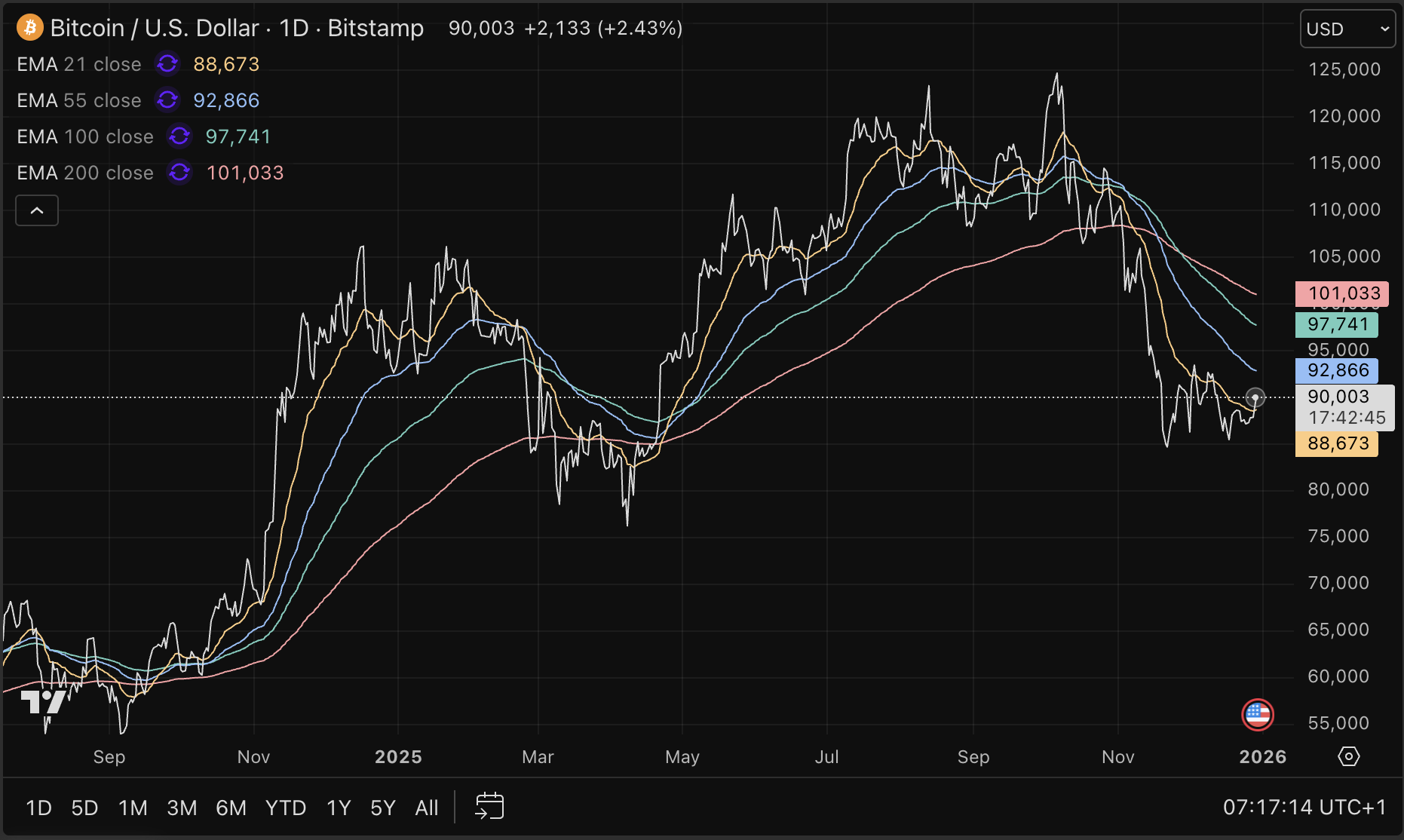 So könnte Momentum entstehen und eine Phase, in der sich Bitcoin erholt und beispielsweise im ersten Quartal 2026 über die 101.143-Dollar-Marke klettern könnte. Dort befindet sich momentan der 200-tägige exponentielle Kursdurchschnitt (rote Linie).