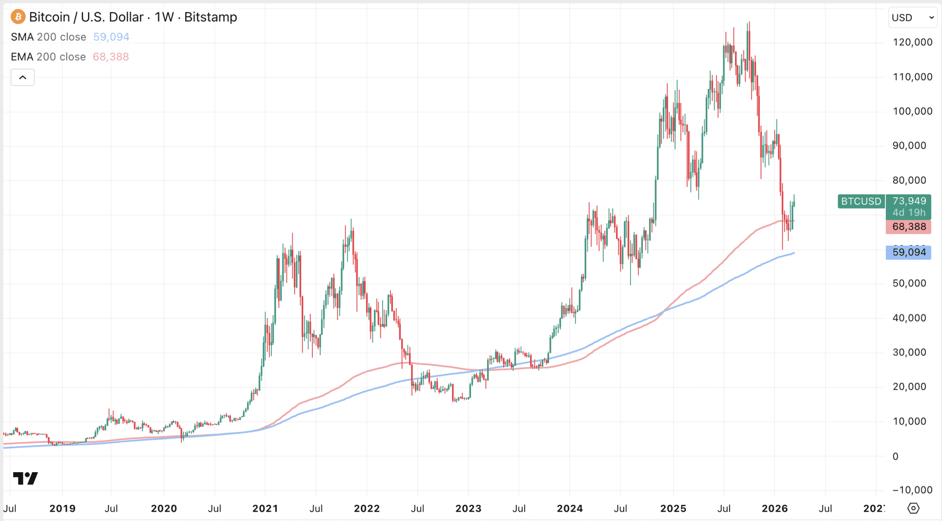 Auf dem Wochendiagramm handelt Bitcoin derzeit über dem 200-wöchigen exponentiellen Kursdurchschnitt. Dieser liegt momentan bei 68.388 Dollar, was auch ungefähr dem Allzeithoch des Bullenmarkts von 2021 entspricht. Diese Linie hat daher eine besondere Bedeutung.