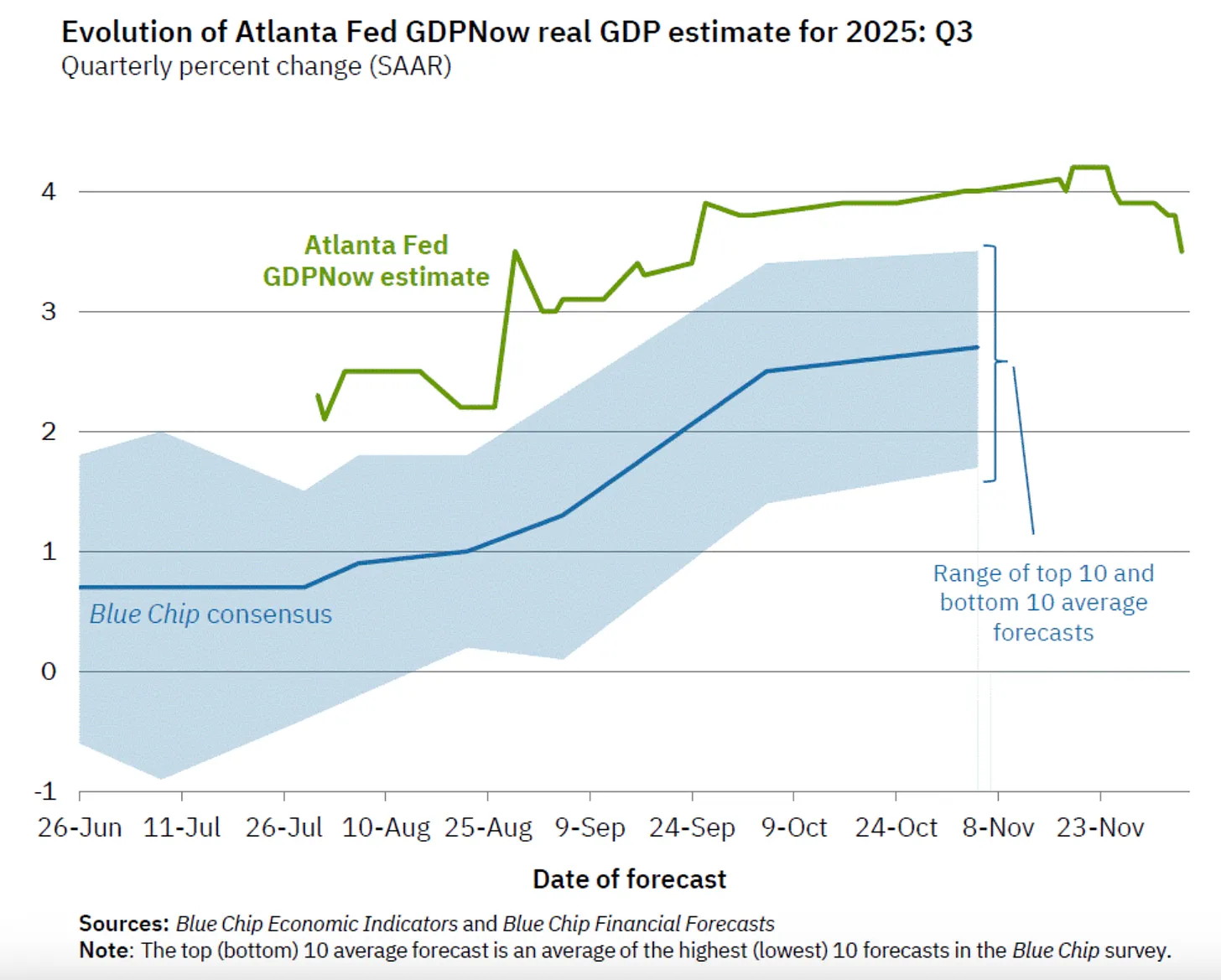 Laut dem GDPNow-Modell der Atlanta Federal Reserve (siehe obenstehendes Diagramm) liegt das Wirtschaftswachstum weiterhin bei etwa 3,5 Prozent. Dies ist das inflationsbereinigte Wirtschaftswachstum.
