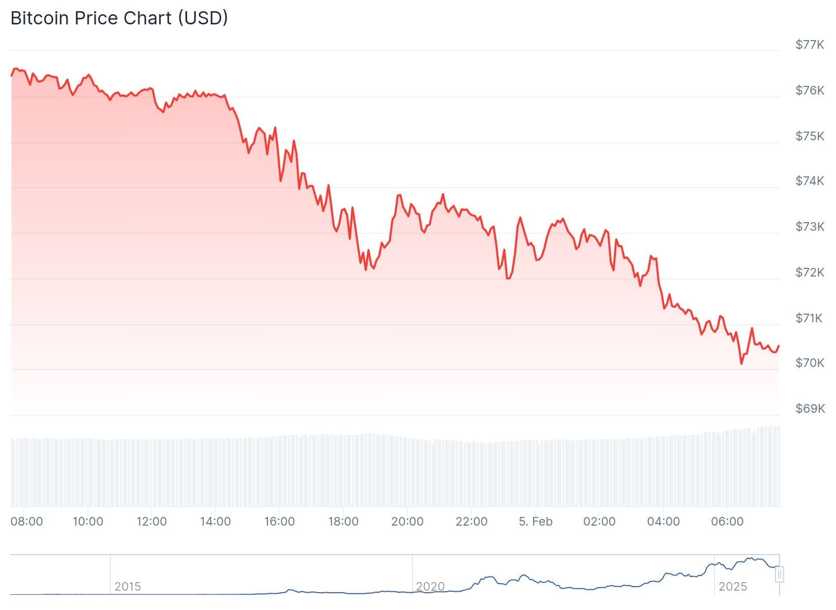 Immer wenn man denkt, dass Bitcoin (BTC) kaum noch weiter fallen kann, setzt die Kryptowährung ihren Abwärtstrend fort. Auch in der vergangenen Nacht ist der Kurs weiter gesunken und hat zum ersten Mal seit November 2024 wieder die Marke von 70.000 Dollar erreicht. Die Panik am Markt ist spürbar, und die Stimmung ist am Boden.