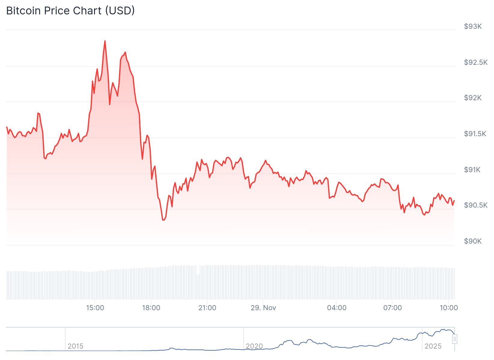 Doch dort konnte sich Bitcoin nicht halten. Innerhalb kurzer Zeit wurden die Gewinne wieder ausgelöscht. Bitcoin drehte sogar ins Minus und fiel in nur zwei Stunden um 2,7 Prozent. Der Kurs erreichte ein Tagestief von 90.300 US‑Dollar und notiert inzwischen wieder ein paar Hundert Dollar höher.