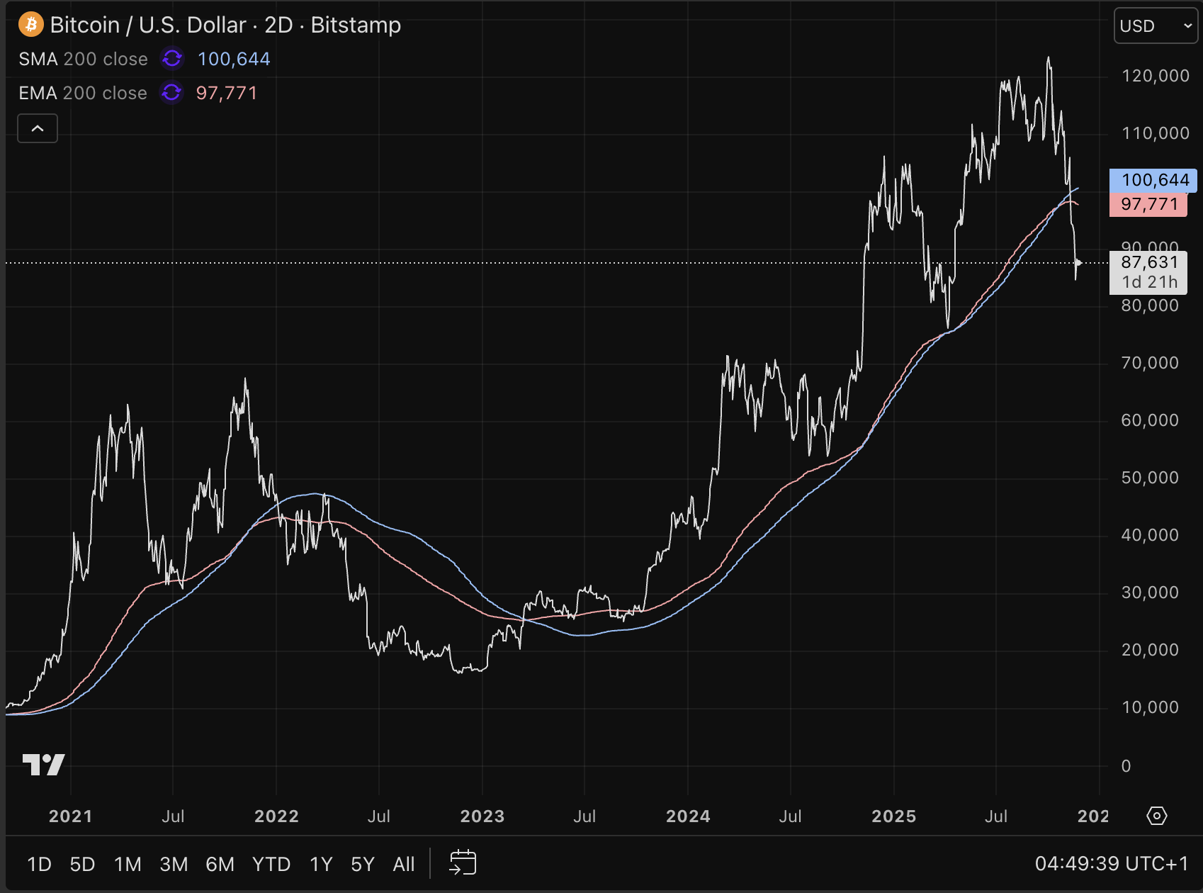 Nach den massiven Kursrückgängen der vergangenen Wochen hat Bitcoin mehrere wichtige Unterstützungszonen im Chart verloren. Unten sehen wir den 200-Tage-Durchschnitt (blau) und den 200-Tage-Exponentiellen Durchschnitt (rot).
