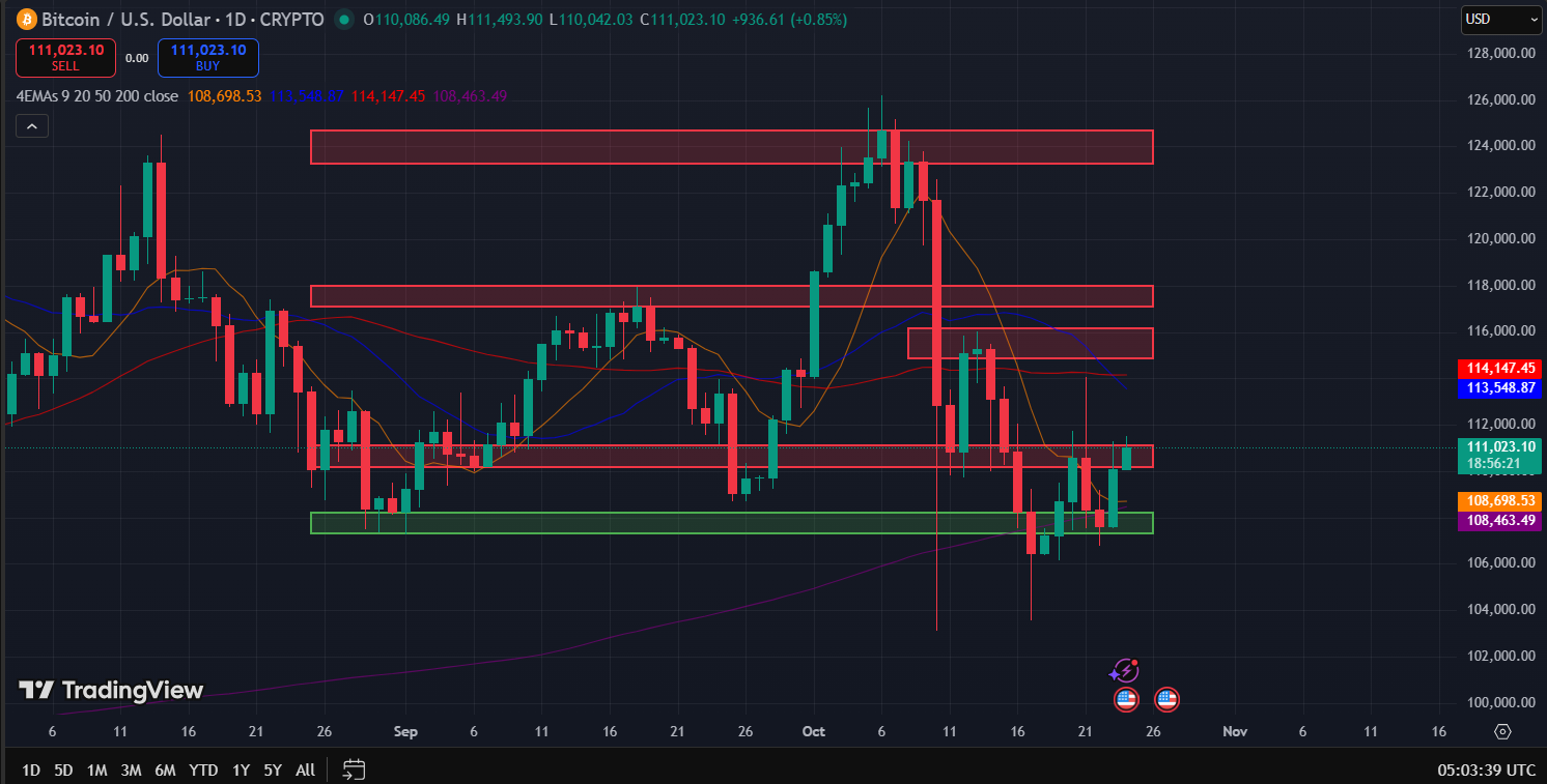 In der Grafik unten ist gut zu sehen, dass der Kurs nun an einem wichtigen Widerstandsniveau angekommen ist. Wenn die 111.000 Dollar geknackt werden, warten die nächsten Stationen zwischen 114.500 und 116.000 Dollar und anschließend zwischen 117.000 und 118.000 Dollar.