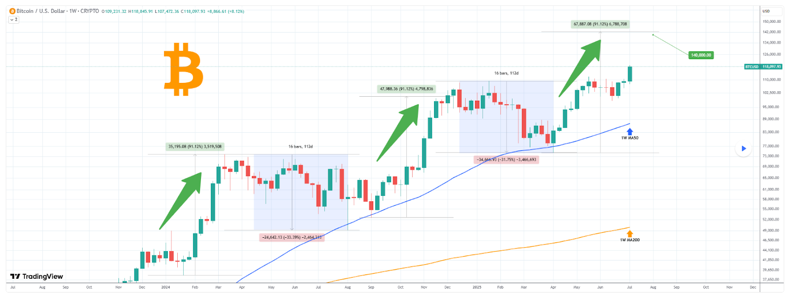 Die aktuelle Aufwärtsbewegung begann am 7. April. Seitdem entwickelt sich ein sogenanntes ‘Bull Flag’-Muster, das sich zwischen Mitte Mai und Juni herausbildete. Wenn BTC dieselbe Kursstruktur wie Ende letzten Jahres folgt, liegt ein Kursziel von 140.000 Dollar im August 2025 in Reichweite.