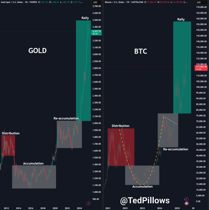 Laut Ted Pillows befindet sich BTC genau an demselben Punkt im Marktzyklus wie Gold kurz vor seinem historischen Durchbruch. Wenn das stimmt, können sich Investoren auf einen Sprung in Richtung 160.000 Dollar vorbereiten – und das noch vor dem Jahreswechsel.