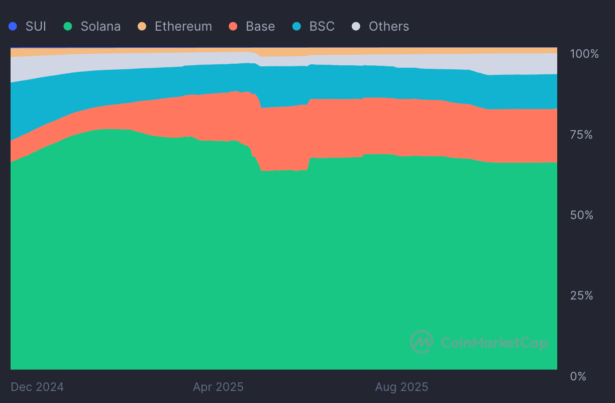 Diese Zugänglichkeit erklärt zum Teil, warum Solana mittlerweile 64 Prozent aller neuen Token verarbeitet. Besonders im Sommer geriet die Zahl der Einführungen außer Kontrolle. Im Juli erreichte die Anzahl neuer Kryptos an einem Tag einen Höchststand von 1,3 Millionen.