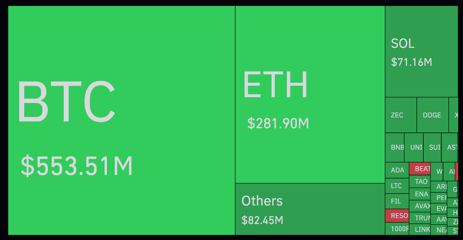 Allein bei Bitcoin wurden Positionen im Wert von über 553 Millionen Dollar liquidiert. Das ist fast die Hälfte des gesamten Liquidationsbetrags. Auffällig: Bei 515 Millionen Dollar handelte es sich um Long-Positionen – also die überwältigende Mehrheit.