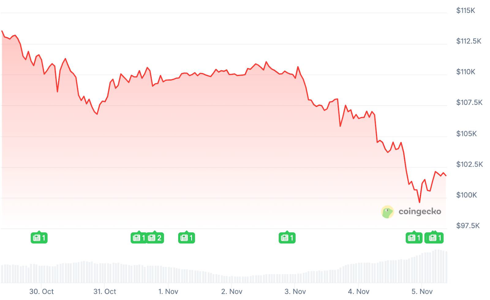 Bitcoin (BTC) erlebt erneut einen schmerzhaften Tag. Am Morgen fiel der Kurs unter die psychologische Marke von 100.000 Dollar und berührte kurzzeitig 99.000 Dollar. Inzwischen hat sich der Preis leicht auf rund 102.900 Dollar erholt, doch der Druck auf den Markt bleibt hoch.