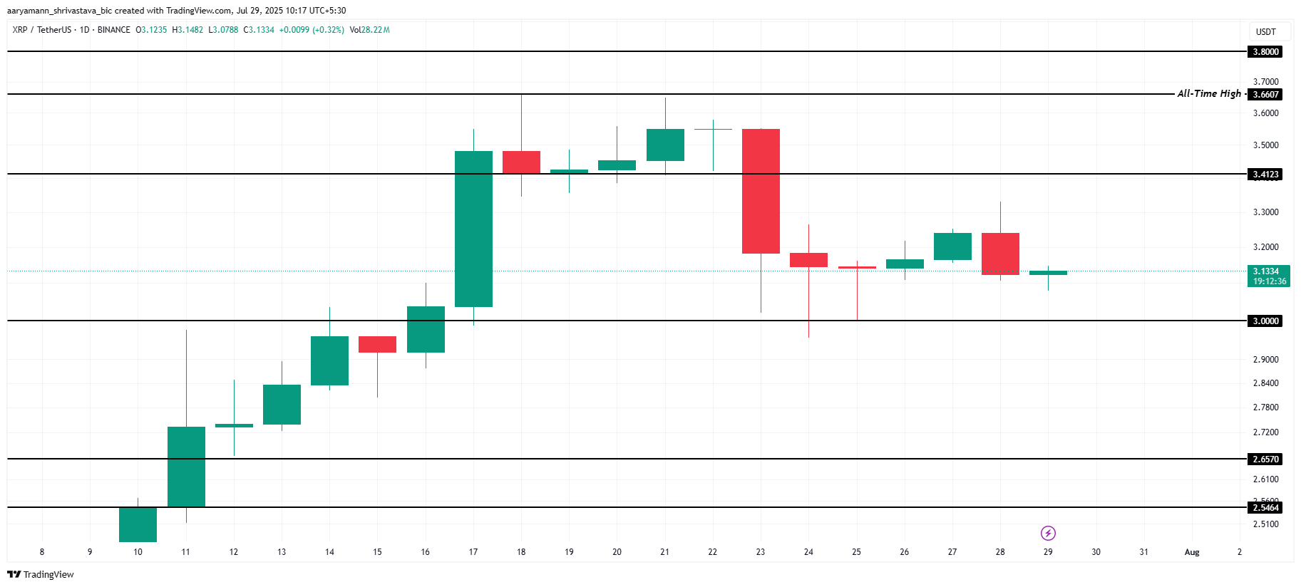 Der Kurs von XRP notiert zum Zeitpunkt des Schreibens bei 3,13 Dollar. Damit liegt die Münze knapp über dem psychologischen Unterstützungsniveau von 3 Dollar. Wenn dieses Niveau bricht, erwarten Analysten einen möglichen Rückgang auf 2,65 Dollar.