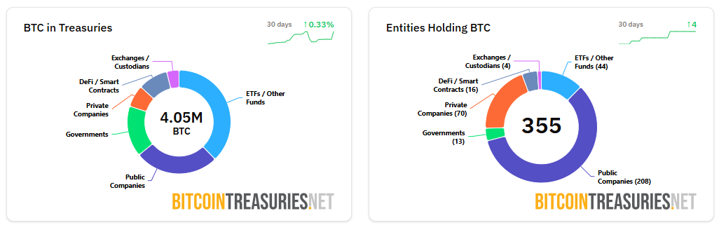 Immer häufiger kaufen Unternehmen Bitcoins für die eigene Reserve – so plante es jüngst etwa Prenetics. Inzwischen gibt es laut BitcoinTreasuries bereits 355 einzigartige Einheiten, die die Digitalwährung halten. Zusammen besitzen diese Akteure inzwischen 4,05 Millionen BTC – im Wert von über 374 Milliarden US-Dollar.