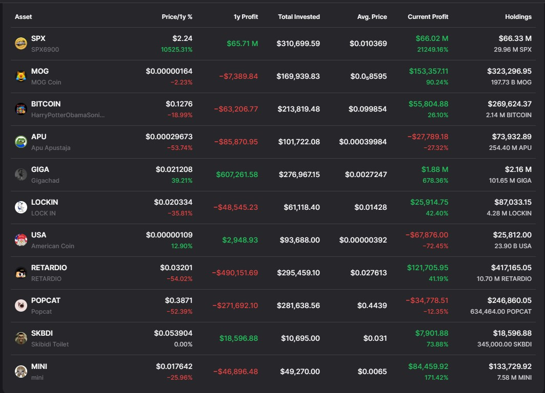 Aus den Daten geht hervor, dass Mahmudov insgesamt etwa 1,86 Millionen Dollar für memecoins ausgegeben hat. Der Gesamtwert seines Portfolios wird auf mehr als 70 Millionen Dollar geschätzt. Den größten Gewinn erzielte er mit dem memecoin SPX6900, der innerhalb eines Jahres um über 10.500 Prozent gestiegen ist.