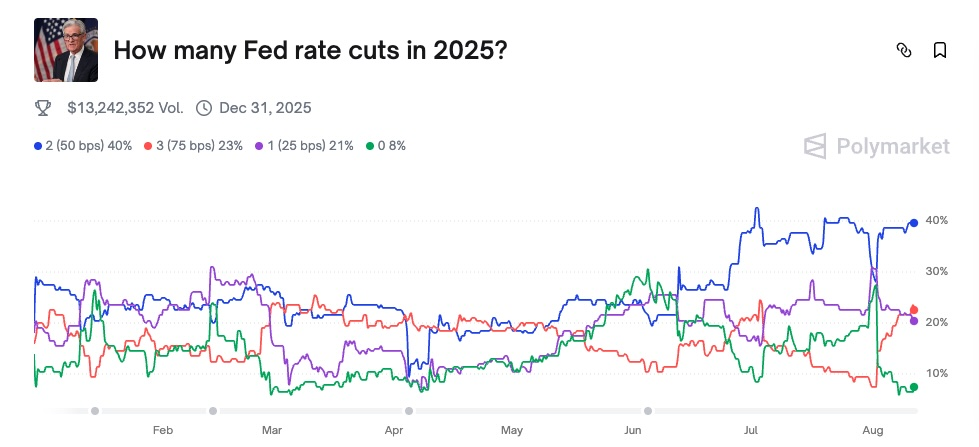 Laut Marktdaten von Polymarket liegt die Wahrscheinlichkeit derzeit bei 40 Prozent, dass die Fed die Zinsen in diesem Jahr insgesamt um 50 Basispunkte senkt. Die Wahrscheinlichkeit für Senkungen um 75 Basispunkte ist innerhalb einer Woche von 8 auf 23 Prozent gestiegen.