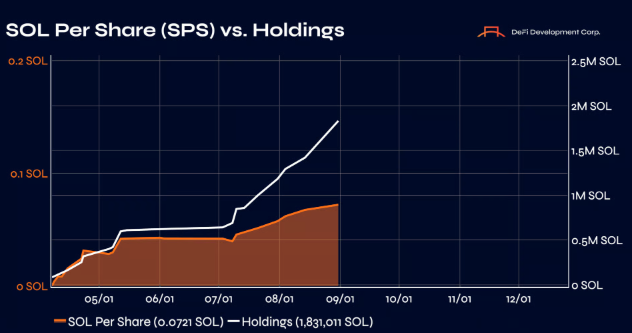 Wie jedes andere Krypto-Treasury-Unternehmen ist das Ziel von DeFi Development Corp, so viele Coins (das Unternehmen hat angegeben, sich rein auf Solana zu konzentrieren) pro Aktie zu haben. Im Diagramm unten ist schön zu sehen, wie dies in der letzten Zeit zugenommen hat, obwohl die letzten Käufe hier noch nicht berücksichtigt sind.
