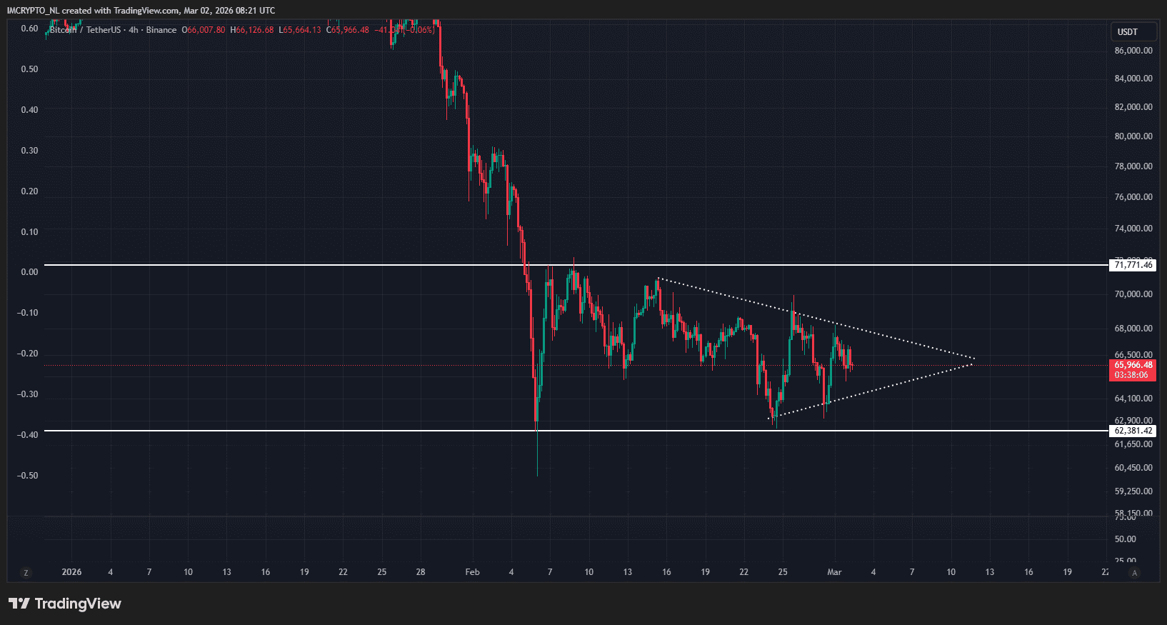 Zugleich sehen wir, dass sich der Kurs in einem immer engeren Bereich bewegt. Es handelt sich um ein symmetrisches Dreieck, bei dem die Widerstandslinie sinkt und die Unterstützungslinie steigt. Am Samstag markierte Bitcoin ein höheres Tief, nachdem die USA und Israel Angriffe auf den Iran unternommen hatten.