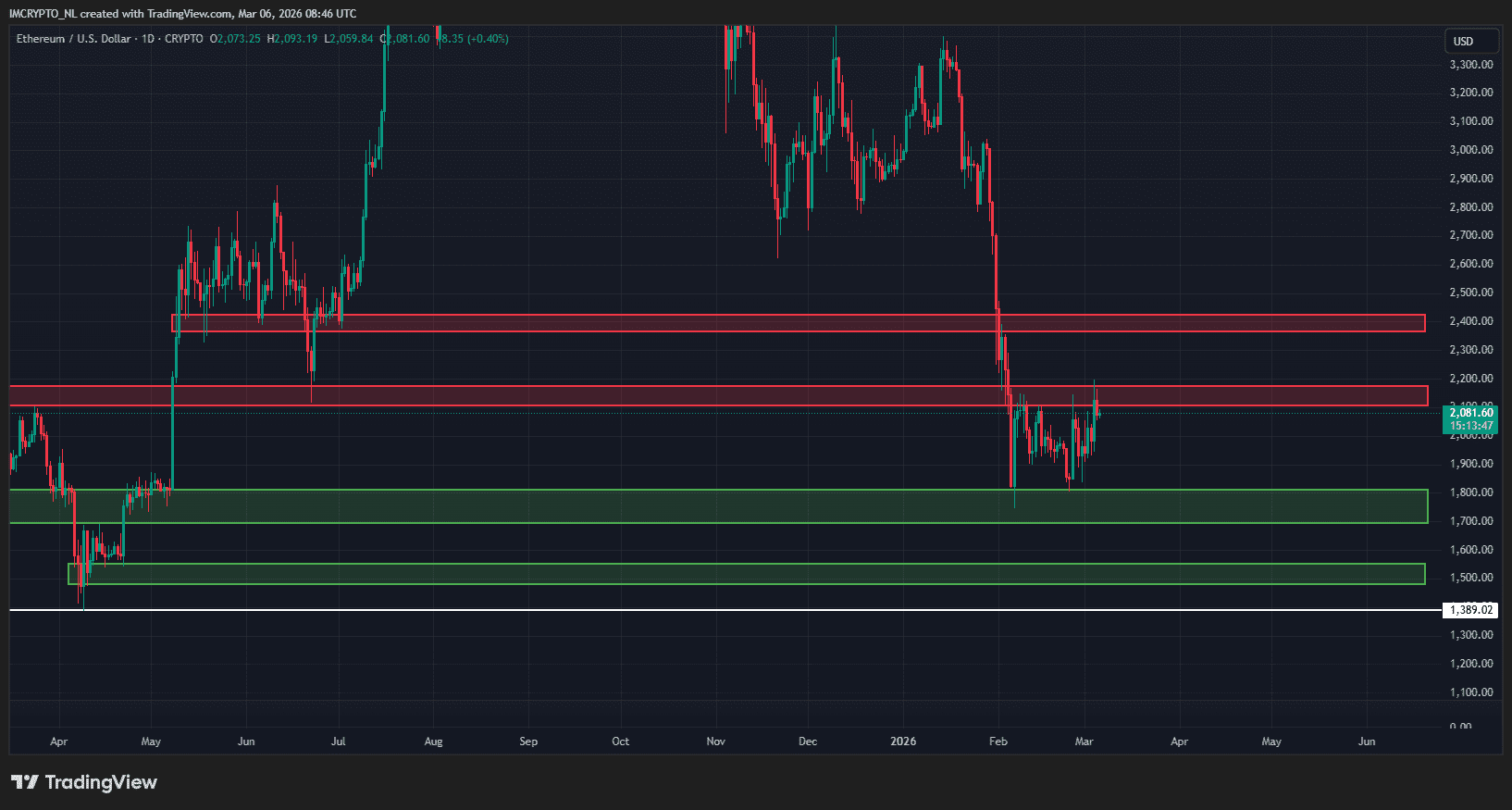 Betrachten wir Ethereum, die größte Altcoin auf dem Markt. Hier sehen wir, dass der Kurs vorerst an seinem eigenen Widerstandsniveau über 2.100 Dollar gescheitert ist.
