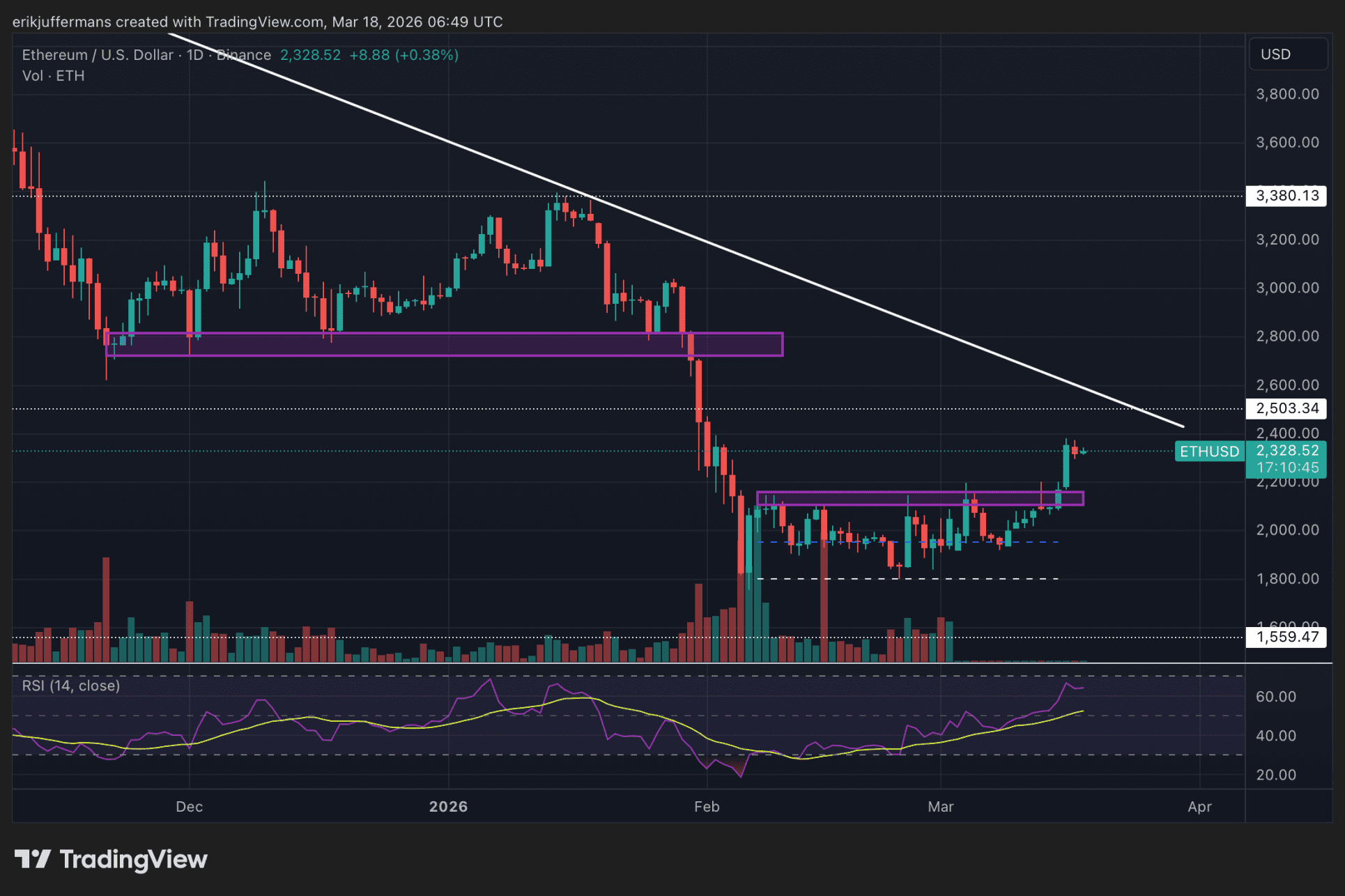 Die täglichen Schwankungen lenken vom größeren Bild ab. Auf der wöchentlichen Grafik ist Ethereum laut Juffermans auf dem Weg zu 2.800 Dollar, dem letzten bedeutenden Widerstandsniveau.