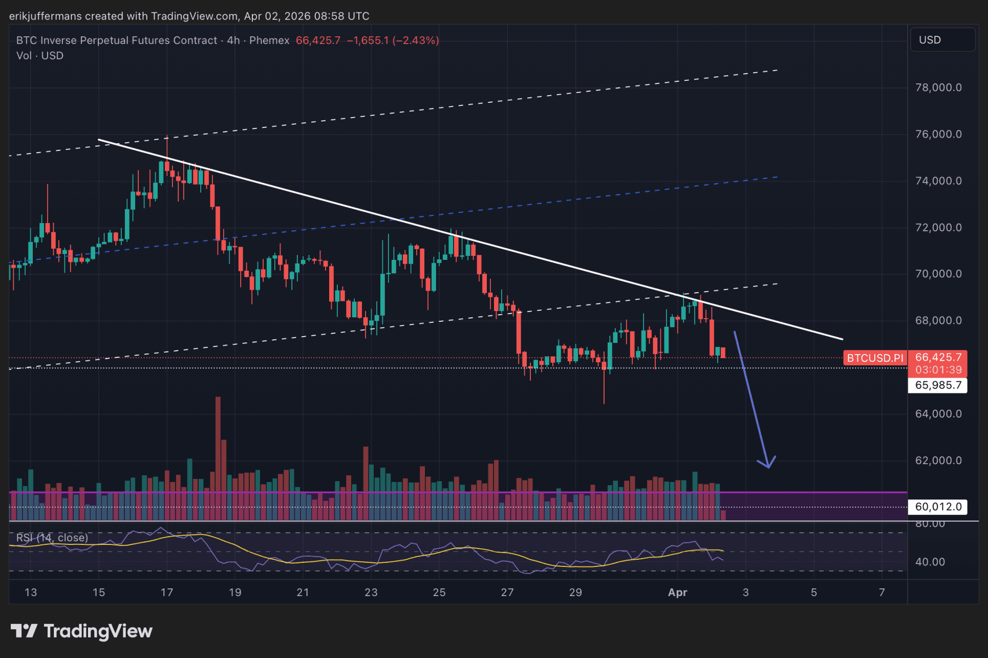 Obwohl die Aussagen von Trump nicht hilfreich sind, liegt der aktuelle Rückgang im erwarteten Rahmen. In früheren Analysen haben wir bereits darauf hingewiesen, dass der BTC-Kurs in den letzten Tagen auf zwei Widerstandslinien gestoßen ist: der Unterseite des seit Monaten bestehenden Aufwärtskanals und einer Abwärtstrendlinie, die seit dem 17. März eine Rolle spielt.