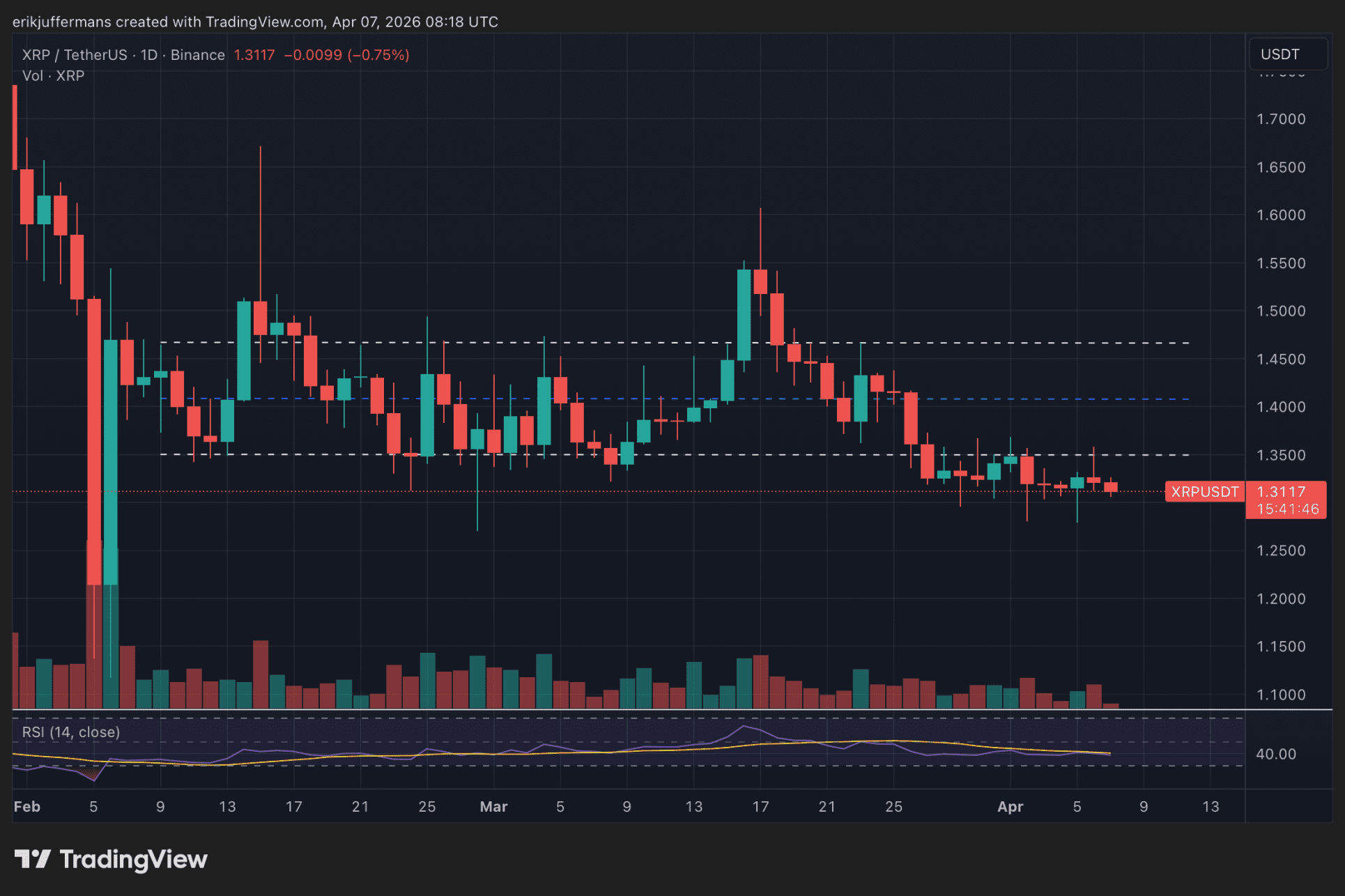 Auf dem Tageschart wird die Bedeutung der Zone um 1,35 Dollar noch deutlicher. Diese Zone bildete in den vergangenen Monaten eine klare Untergrenze. Am Freitag, den 27. März, fiel XRP unter diese Grenze. Auch wenn ein schneller Rückgang ausblieb, wirkt der Kurs seitdem sehr schwach.