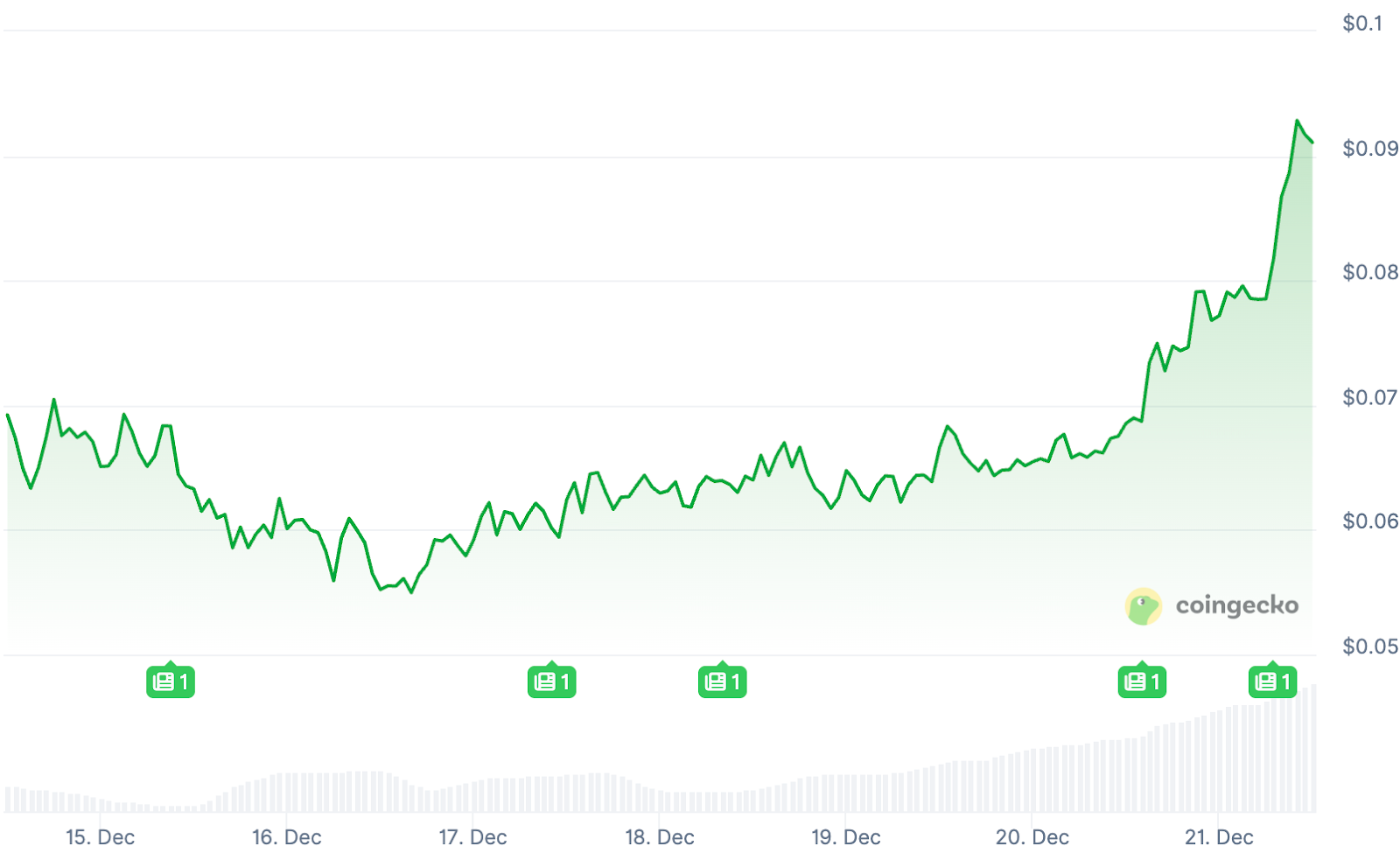 Der NIGHT-Token ist in den letzten 24 Stunden um über fünfunddreißig Prozent gestiegen und liegt nun bei 0,091 Dollar. Damit ist der Preis mehr als elf Cent höher als das Tief von 0,024 Dollar. Das bedeutet einen Kursgewinn von 284 Prozent in sehr kurzer Zeit.