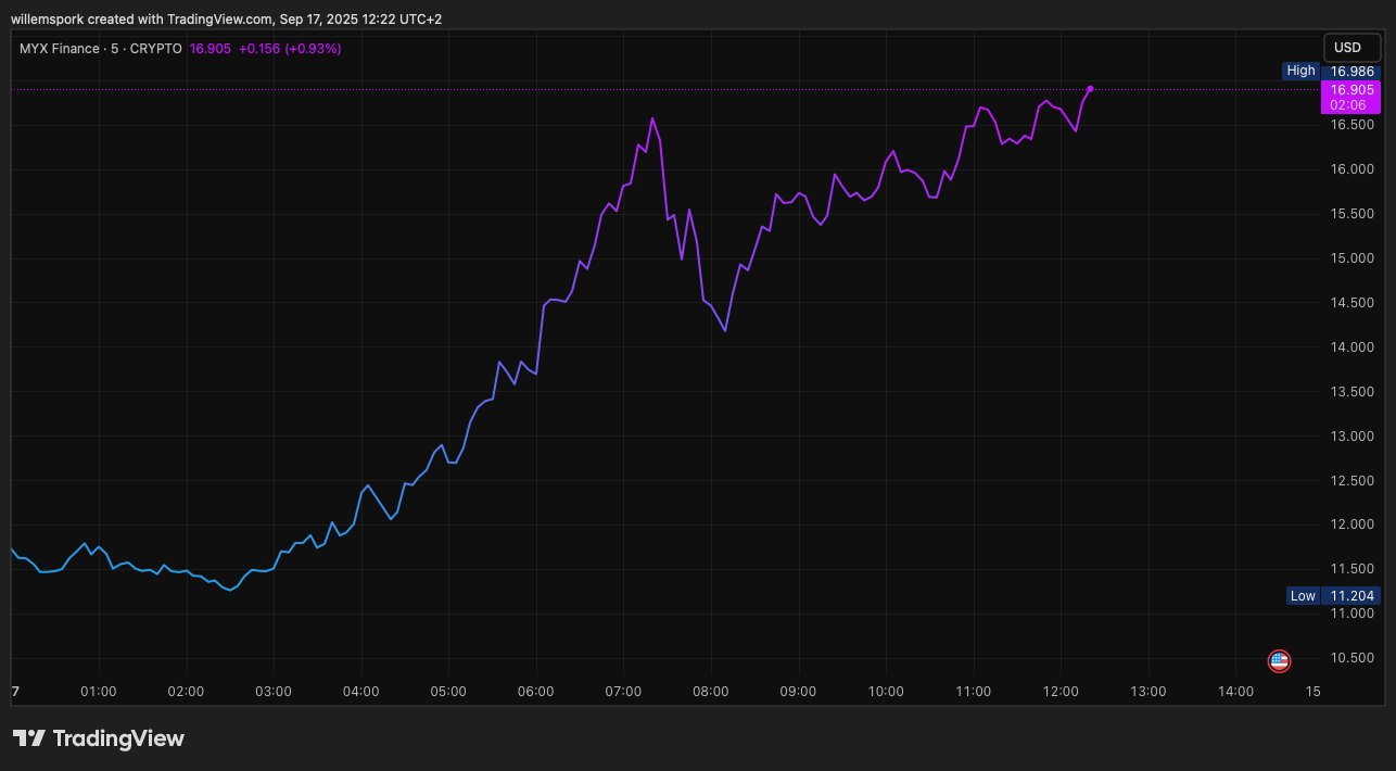 MYX Finance erwacht heute erneut zum Leben und verzeichnete seit seinem Tiefpunkt gestern Abend von 10,60 Dollar einen erheblichen Anstieg. Mittlerweile handelt der Token deutlich höher, mit einem Kurs von fast 16,50 Dollar zum Zeitpunkt des Schreibens.