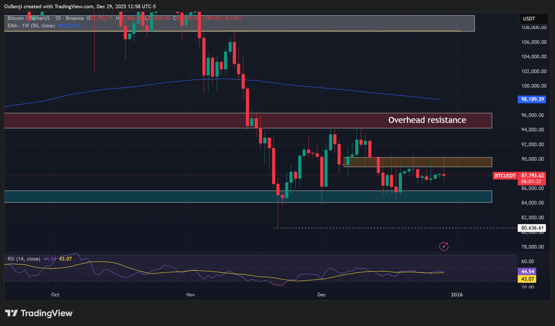 Solange diese Unsicherheit anhält, bleibt BTC wahrscheinlich zwischen 88.000 und 94.000 Dollar gefangen. Seit Mitte Dezember gelingt es dem Kurs nicht mehr, diesen Widerstand zu durchbrechen.