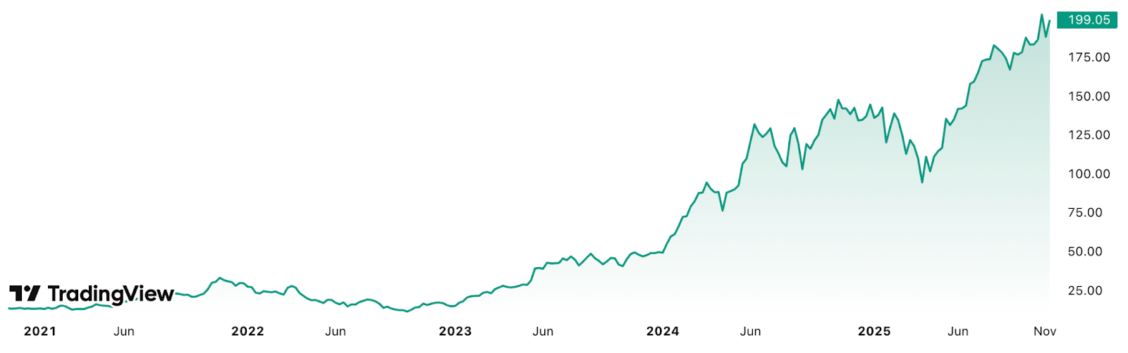 Seit dem KI-Hype im Jahr 2023 ist die Aktie um fast 1.700 Prozent gestiegen. Ende Oktober markierte Nvidia ein Allzeithoch von 212 US-Dollar. Inzwischen ist der Kurs etwas zurückgegangen und notiert knapp unter 200 US-Dollar.