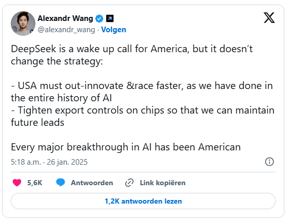 Die Ankunft von DeepSeek wirft auch geopolitische Fragen auf. Alexander Wang, CEO von Scale AI, betonte in einem Beitrag auf X, dass die USA weiter innovativ bleiben und ihre Exportkontrollen für Chips verschärfen müssen, um ihre Führungsposition zu behaupten. Solche Technologien, die in China entwickelt werden, könnten den Wettbewerb weiter verschärfen und strengere amerikanische Beschränkungen für den Export von High-Tech-Geräten nach sich ziehen.