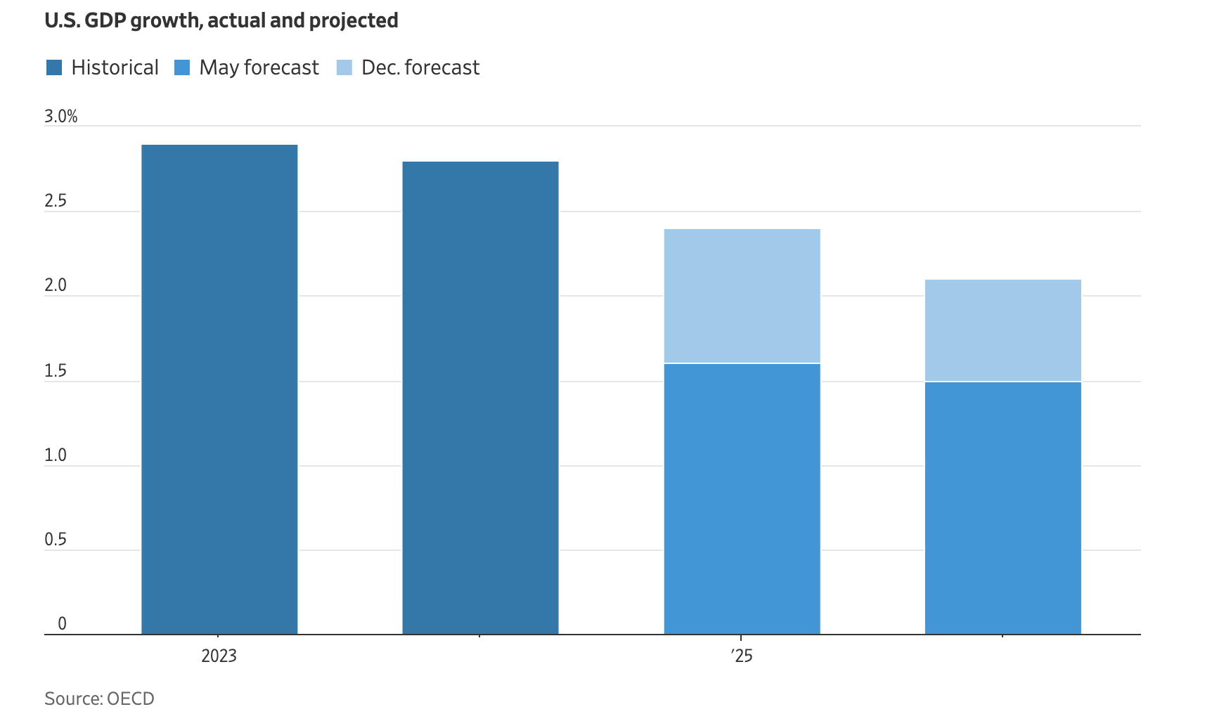 Die Vereinigten Staaten sind laut OECD eine der am stärksten betroffenen Volkswirtschaften. Das Wachstum fällt dieses Jahr auf 1,6% zurück, deutlich niedriger als 2024 und unter den früheren Erwartungen.