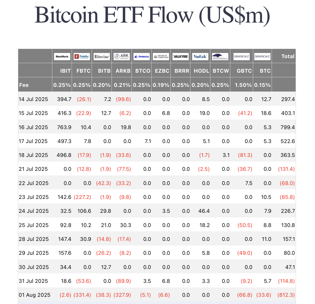 Neue Zahlen von Farside zeigen, dass gestern nicht weniger als 812,3 Millionen Dollar aus den Bitcoin ETFs abgezogen wurden. Diese Summe liegt beängstigend nahe am Tagesrekord vom Februar, als 937,78 Millionen Dollar verschwanden.