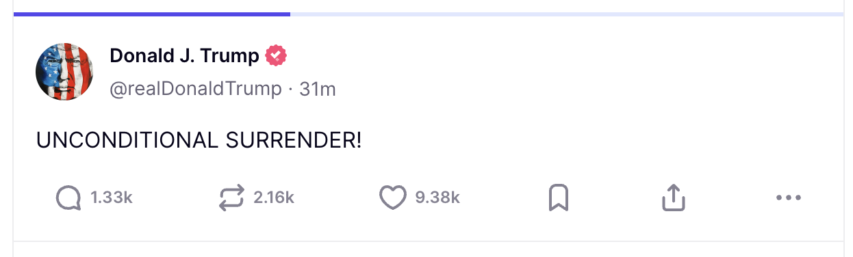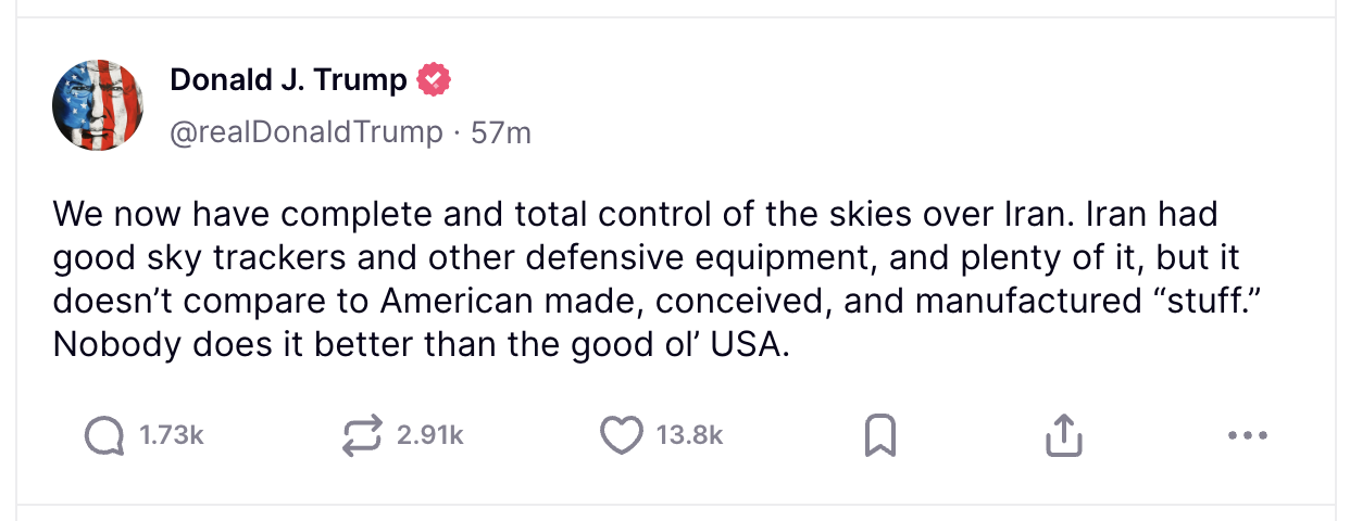 Auf Truth Social schrieb Donald Trump, dass die USA und Israel „volle Kontrolle über den Luftraum in Iran“ haben. Er sprach auch von einer „bedingungslosen Kapitulation“ des Landes.