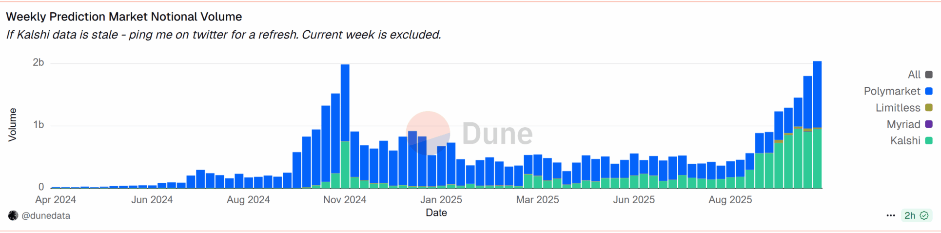 Das Interesse an Prognosemärkten ist weltweit deutlich gestiegen. Laut Daten von Dune Analytics überschritt das Handelsvolumen im Oktober erstmals die Marke von 2 Milliarden US-Dollar pro Woche.