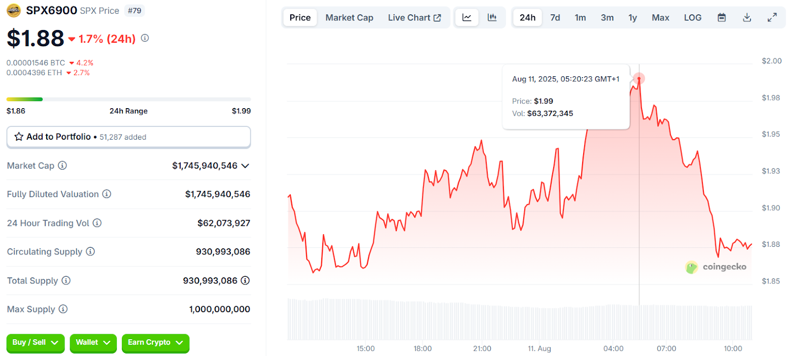 SPX6900, angelehnt an den satirischen S&P 500, war eine der größten Überraschungen im Meme-Coin-Markt 2025. SPX erreichte im Juli ein Allzeithoch von 2,28 Dollar, fiel jedoch auf 1,88 Dollar zurück. Positive technische Signale deuten jedoch darauf hin, dass der Preis bald über 10 Dollar steigen könnte.