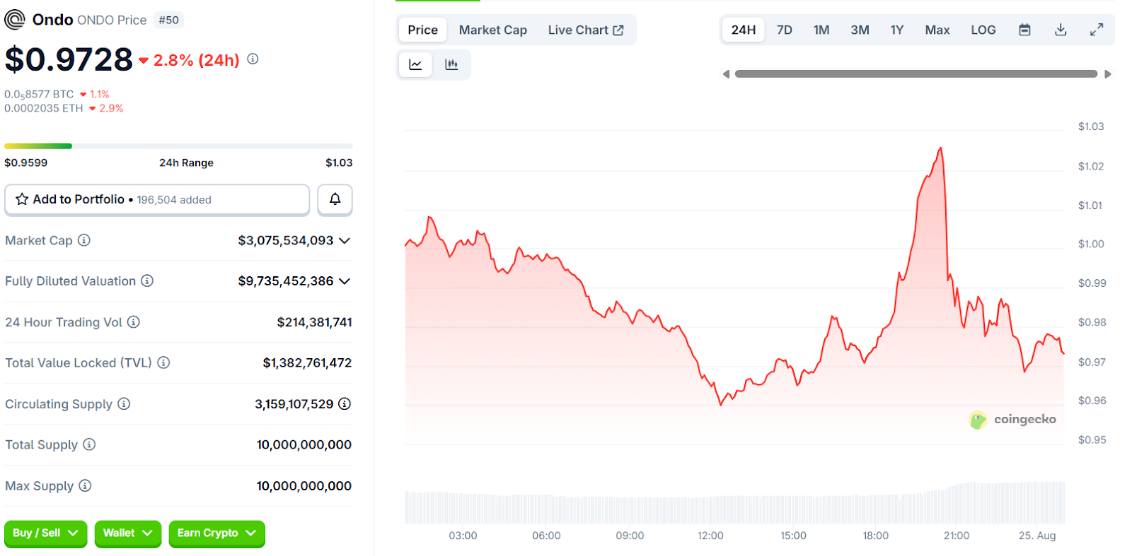Ondo Finance hat sich schnell als führender Anbieter für die Tokenisierung von Real-World-Assets (RWA) etabliert. Bei rund 0,92 $ gehandelt, hat ONDO vom Tiefpunkt aus bereits 480 % zugelegt, gestützt durch unermüdliche Social-Media-Aktivität und institutionelle Partnerschaften.