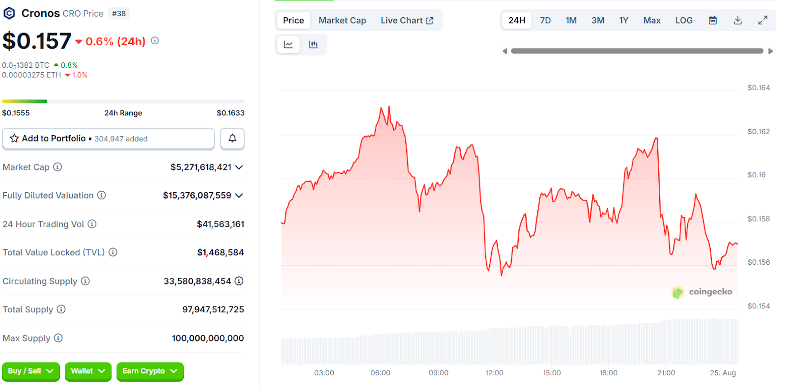 Cronos hat sich 2025 nach mehreren Ökosystem-Upgrades leise zurück ins Rampenlicht geschoben. Aktuell liegt CRO bei etwa 0,1436 $ mit einer Marktkapitalisierung von 4,65 Milliarden $ und hat in den letzten 30 Tagen über 76 % zugelegt – befeuert durch Optimismus rund um Protokollverbesserungen und ETF-Spekulationen.