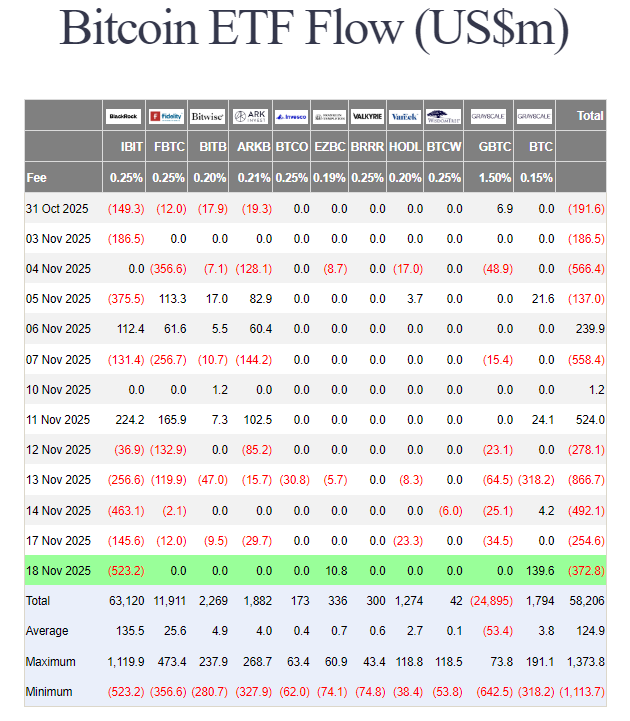 Laut Farside Investors verzeichnete BlackRocks Flaggschiff-Bitcoin-ETF IBIT am 14. November einen rekordverdächtigen Abfluss von 463 Millionen Dollar an einem einzigen Tag. Dies ist die schlechteste Woche seit Februar, in der 2 Milliarden Dollar abgezogen wurden, während sich eine risikoaverse Stimmung über die Märkte ausbreitete.