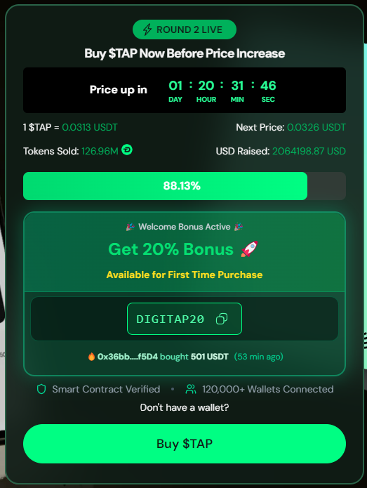 Darüber hinaus wird dies neuen Krypto-Presale-Projekten wie Digitap zugutekommen, da sie durch erhöhte Liquidität wachsen können. Ihr Presale hat bereits über 2 Millionen Dollar eingesammelt und ist damit die derzeit beste Krypto-Investition mit großem Potenzial in naher Zukunft.