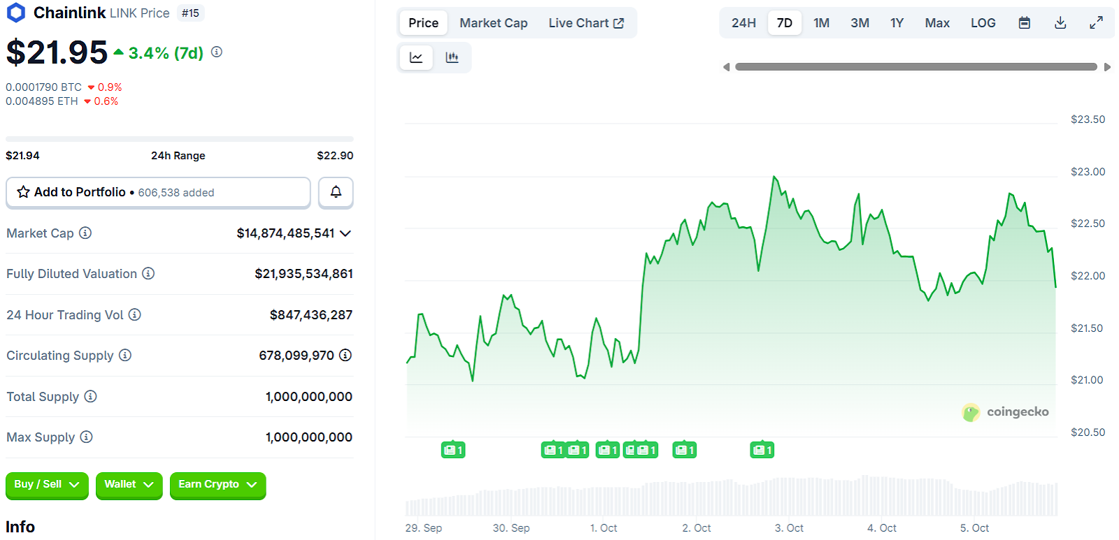 Chainlink ist wieder in den Bereich von 20–23 US-Dollar gestiegen, knapp unter seinen 2025er-Höchstständen bei 28 US-Dollar. Analysten sehen in der Wal-Akkumulation und den sinkenden Börsenreserven deutliche bullische Signale – ein Hinweis darauf, dass LINK für den nächsten Aufwärtsschub akkumuliert wird.