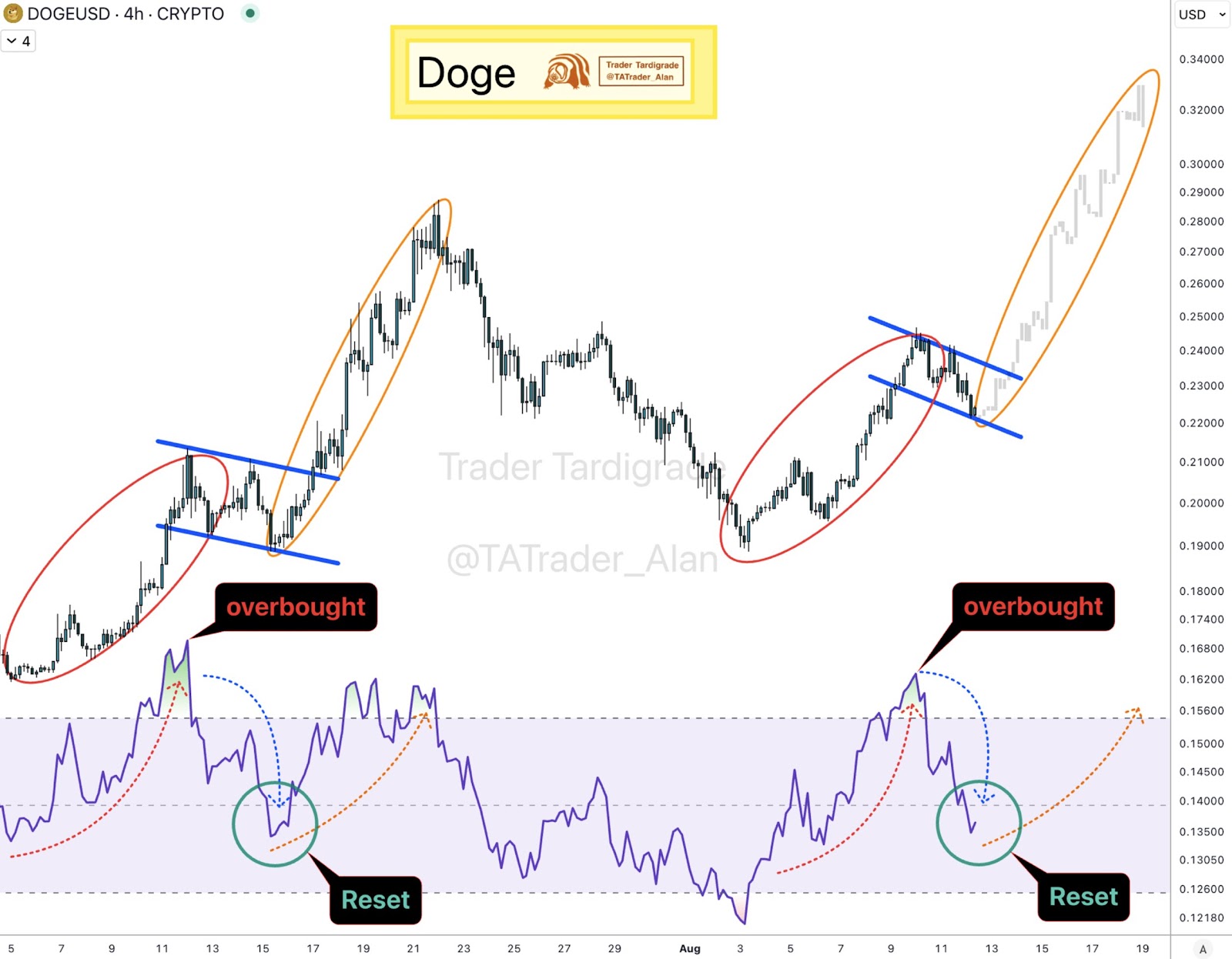 Andere Experten weisen darauf hin, dass Dogecoin seine überkaufte Lage korrigiert hat, da der RSI unter 50 gefallen ist. Dies wird als gesundes Signal gewertet, da das Chartmuster auf eine Bull-Flag-Konsolidierung hindeutet.