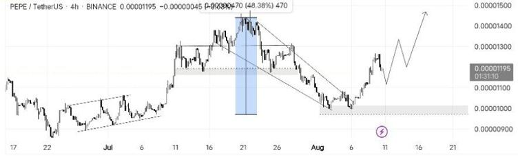 Während einige Modelle optimistisch bleiben, zweifeln viele daran, dass der Hype um PEPE in nachhaltige Gewinne münden wird. Ein Analyst auf X (ehemals Twitter) erklärte, dass der PEPE-Preis nach dem starken Einbruch Ende Juli eine harte Kehrtwende vollzogen hat. Er brach aus dem Abwärtstrend aus und erreicht nun höhere Hochs.